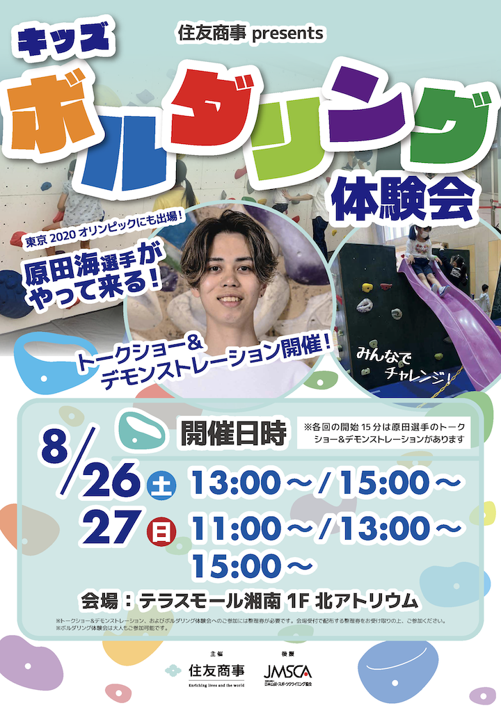 JMSCAのゴールドスポンサーである住友商事株式会社(以下、住友商事)が、8月26日(土)と27日(日)の2日間、プロクライマーの原田海選手をゲストに迎え、キッズボルダリング体験会を開催します。